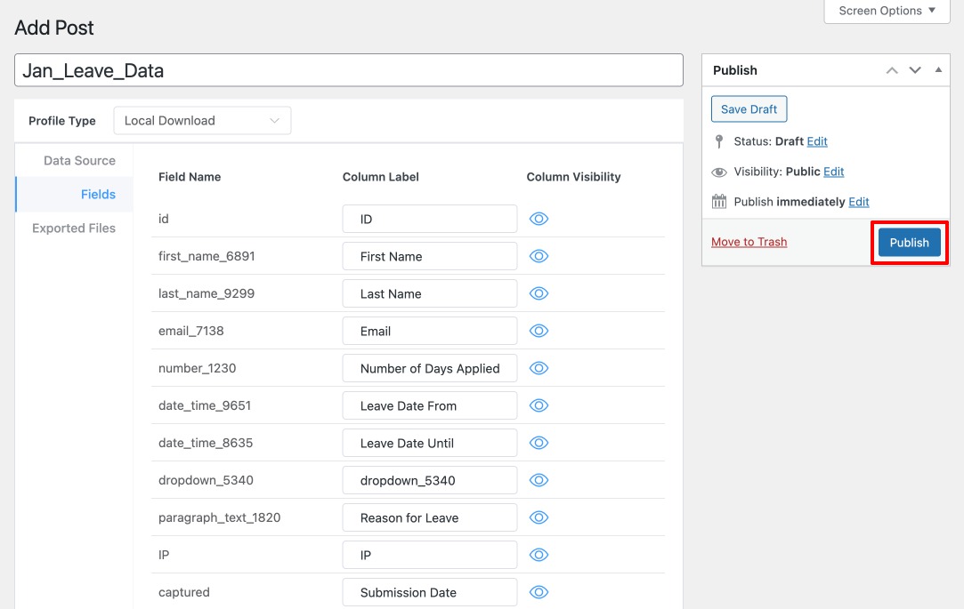 This allows you to export only the relevant information while excluding unnecessary fields. After configuring the fields, click Publish to save the export profile.
