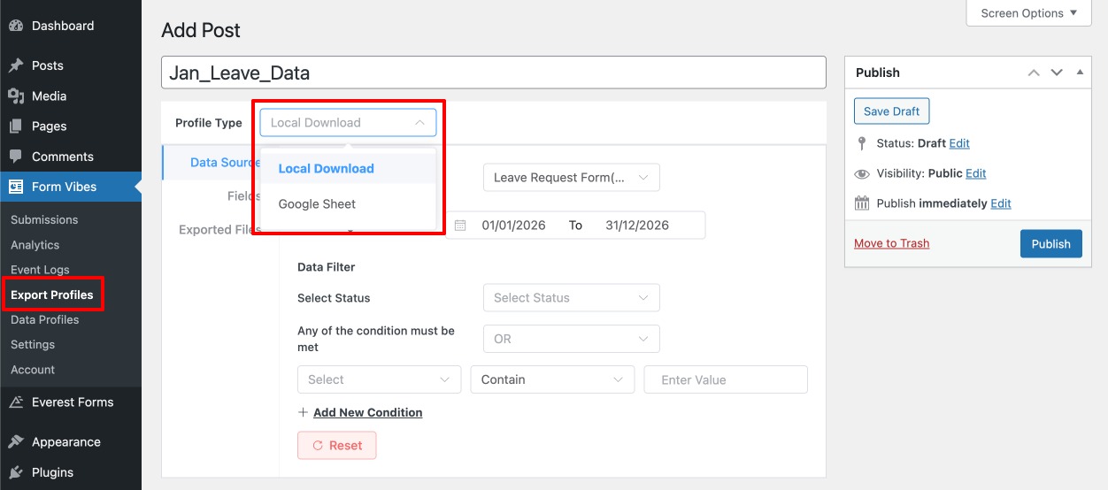 The Export Profile feature available in Form Vibes Pro allows you to export form submissions using predefined filters and conditions.